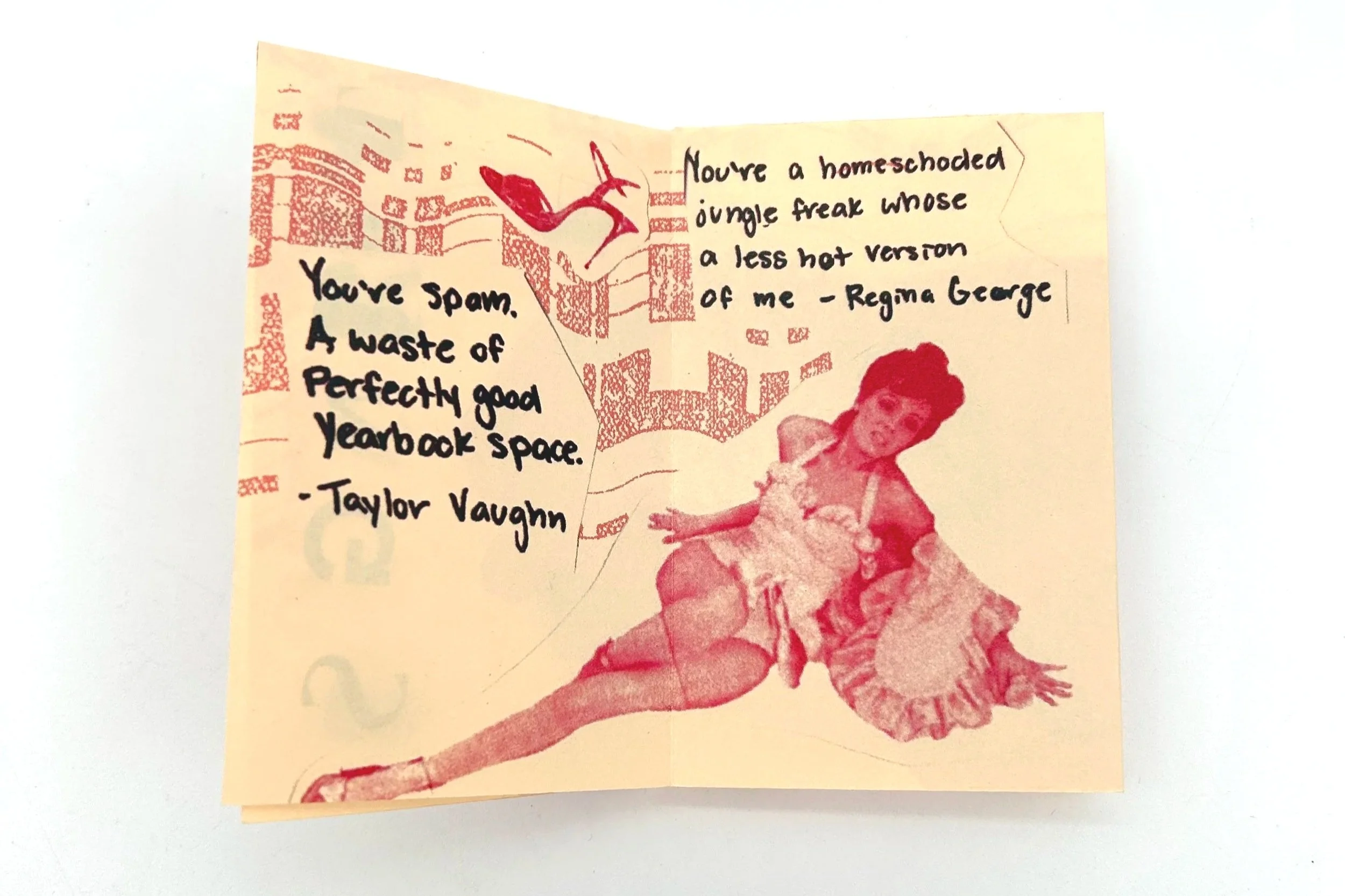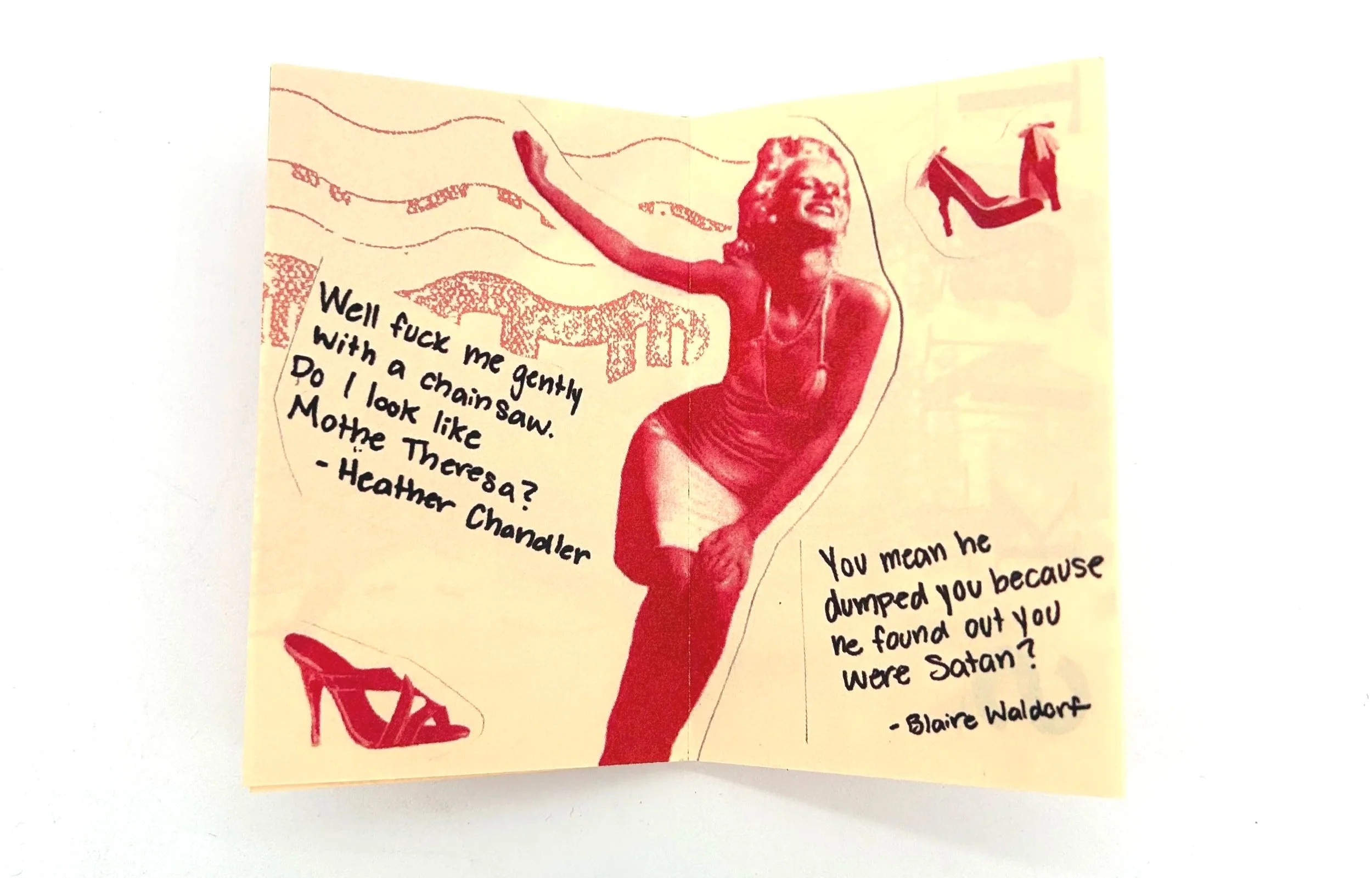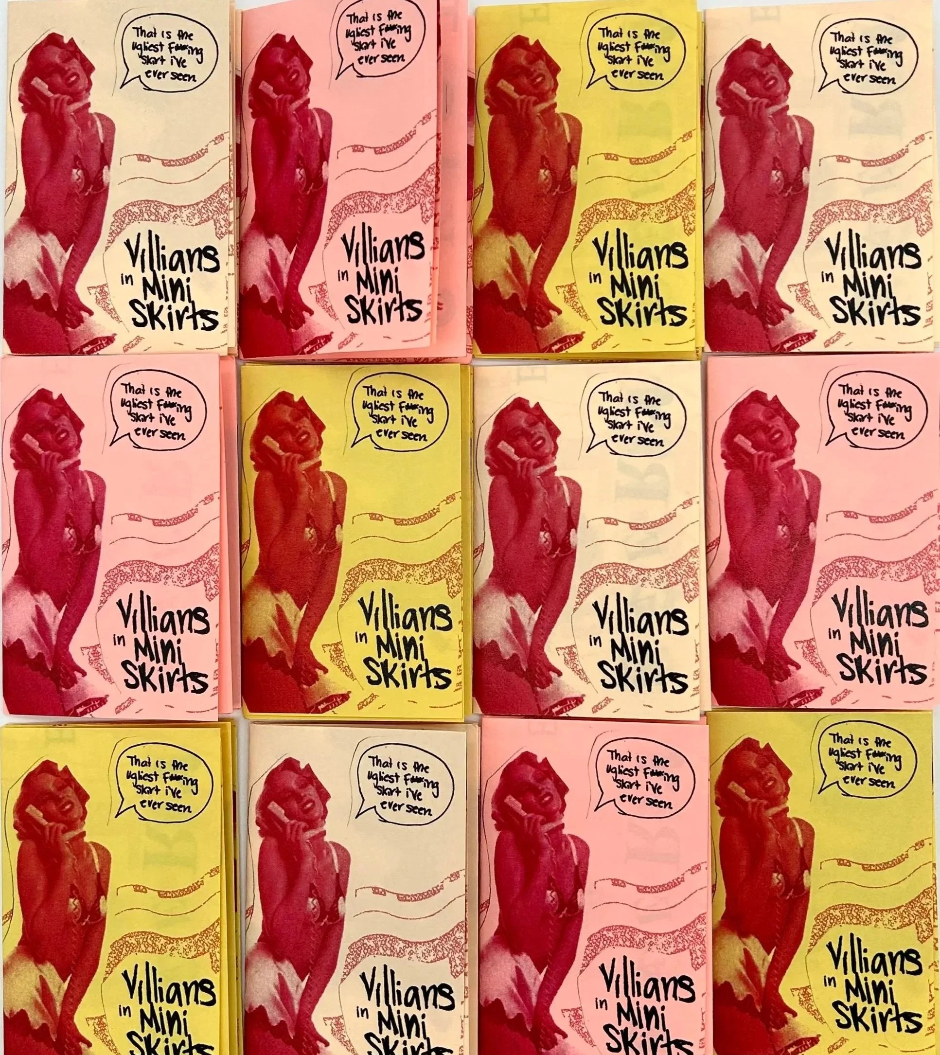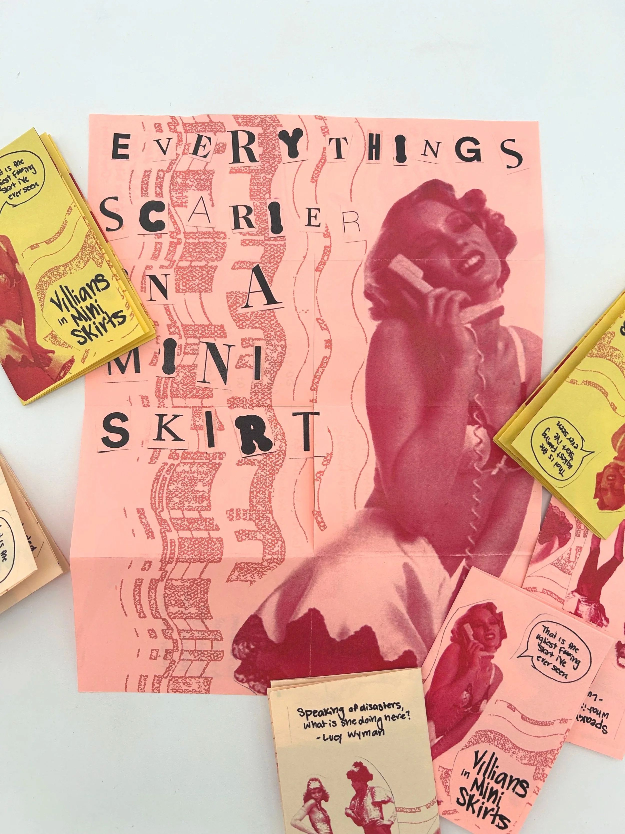 Villains in Mini Skirts is an edition of zines created using collaged elements of 70s imagery, combined with iconic movie quotes . It is an ode to the female villain stereotype, often portrayed in media. Usually this beautiful “evil” girl we are meant to hate becomes a very beloved character for young girls. Showing that typically women with strong opinions get branded as the villain.